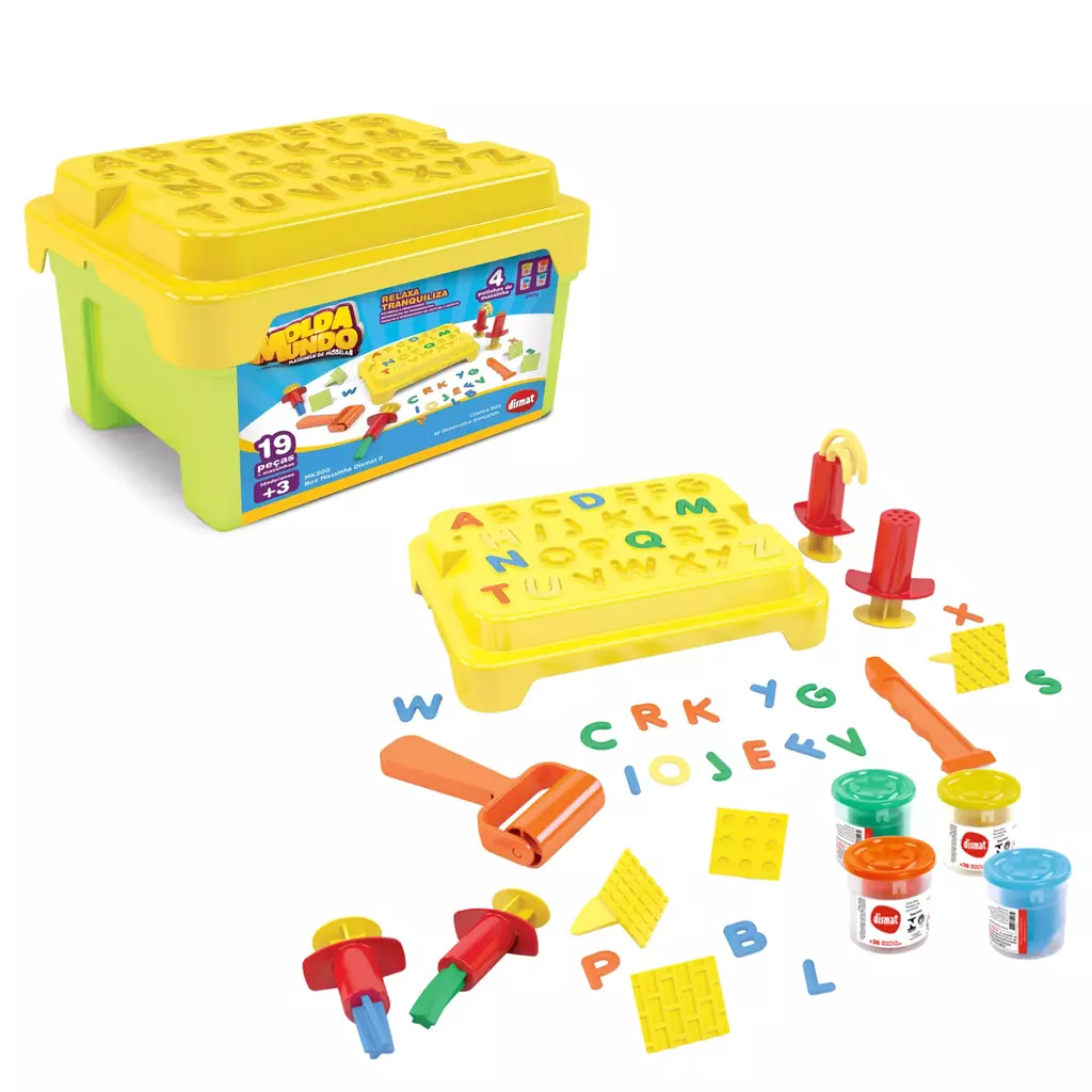 O grande destaque deste kit é a caixa organizadora com tampa ilustrada com o alfabeto completo. Além de funcionar como um recurso educativo visual durante a brincadeira, ela também serve para guardar todas as peças e massinhas após o uso, mantendo tudo organizado de forma prática.
