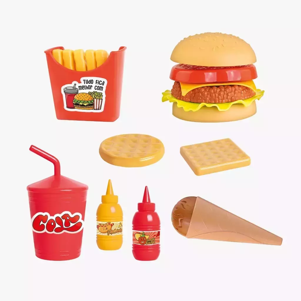 Feita em plástico resistente e segura para crianças a partir de 3 anos, oferece uma experiência de faz de conta envolvente, onde os pequenos podem preparar hambúrguer, fritas, sorvete e montar combos criativos. As peças se encaixam facilmente e guardam na própria maleta, mantendo tudo organizado após o uso.Brincadeira de fast food portátil e interativa