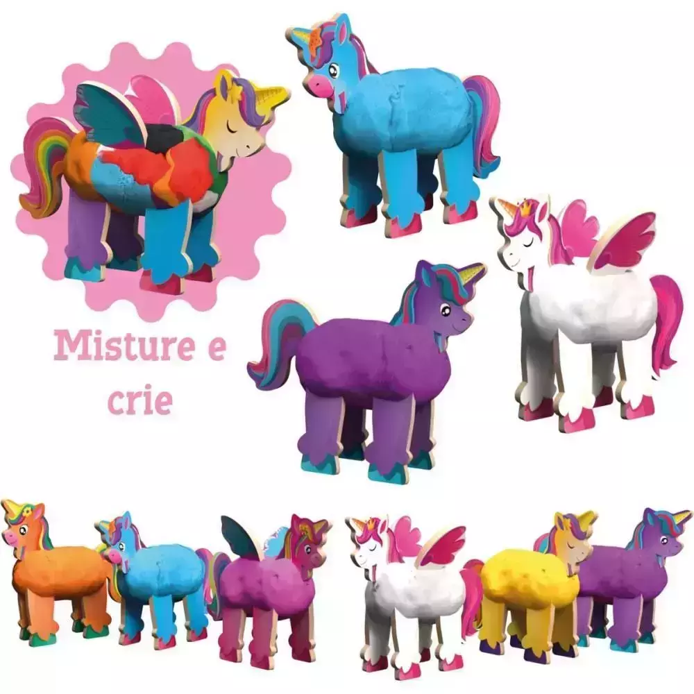 O kit traz o universo dos unicórnios para o mundo da modelagem, oferecendo uma experiência lúdica onde a criança pode criar, personalizar e brincar com seus próprios personagens. São 6 unicórnios para montar e decorar, acompanhados de 12 potes de massinha colorida e diversos acessórios para moldar e brincar.